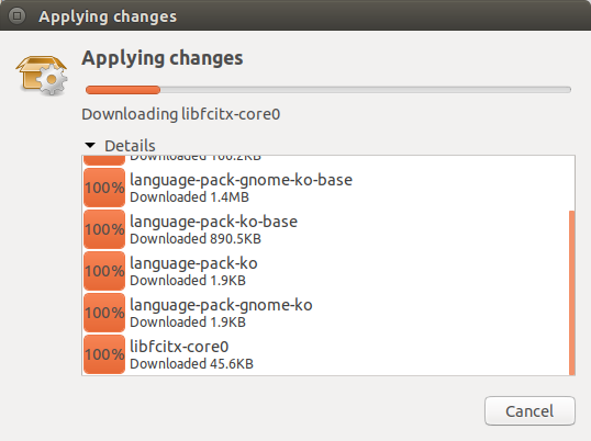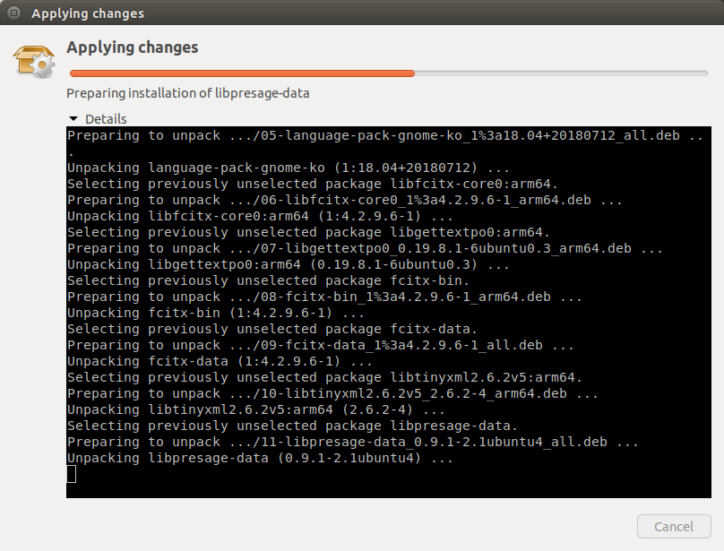 13. 아래의 그림과 같이 각종 폰트와 언어 관련 패키지가 설치됩니다. 이 과정은 다소 시간이 좀 걸립니다.