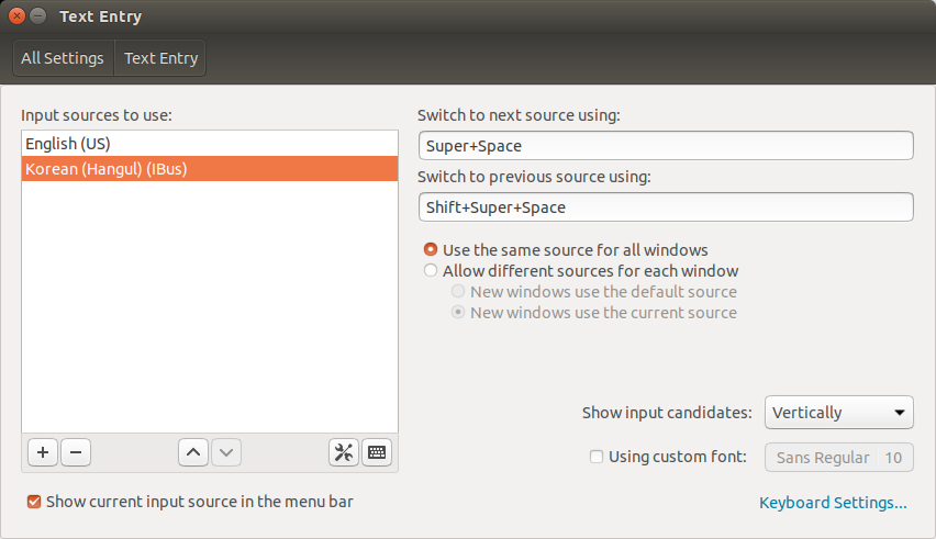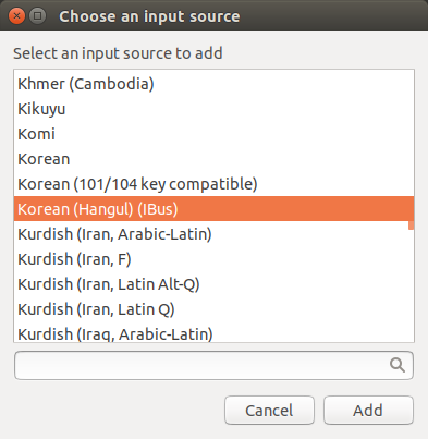 24. Add 버튼을 클릭하면 아래의 그림과 같이 Korean(Hangul)(IBus)가 좌측의 Input sources to use:에 추가됩니다. 한글변환 자판을 설정하기 위해서는 아래의 공구 모양의 설정 버튼을 클릭합니다.