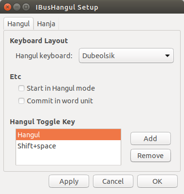 25. 아래의 그림과 같이 Hangul keyboard는 Dubeolsik을 선택하고, 필요에 따라 Etc에서 Start in Hangul mode를 선택합니다. Hangul Toggle Key 로서 Hangul을 선택한 후에 Add버튼을 클릭, Apply을 클릭한 후 OK 버튼을 클릭합니다.