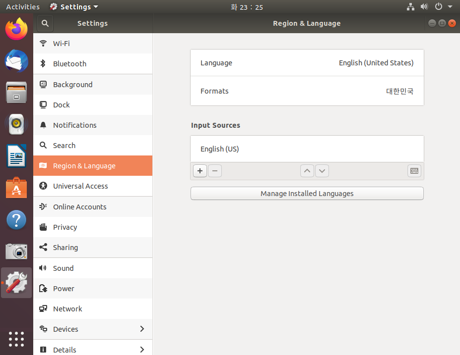 2. 좌측에 "Region & Language"를 선택하면 아래와 같은 메뉴가 출력됩니다.