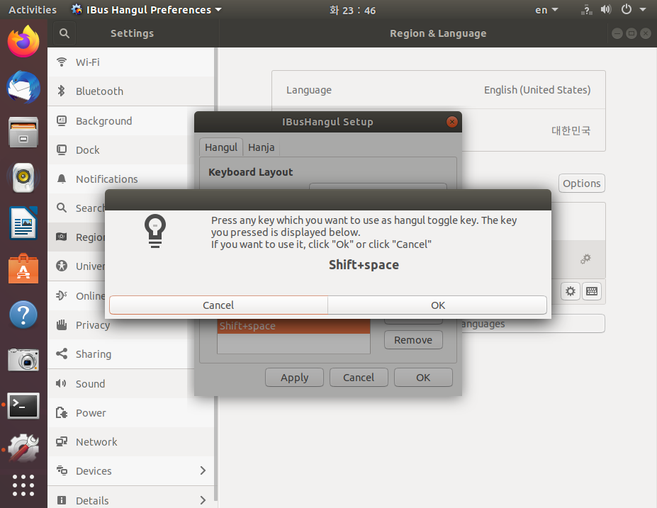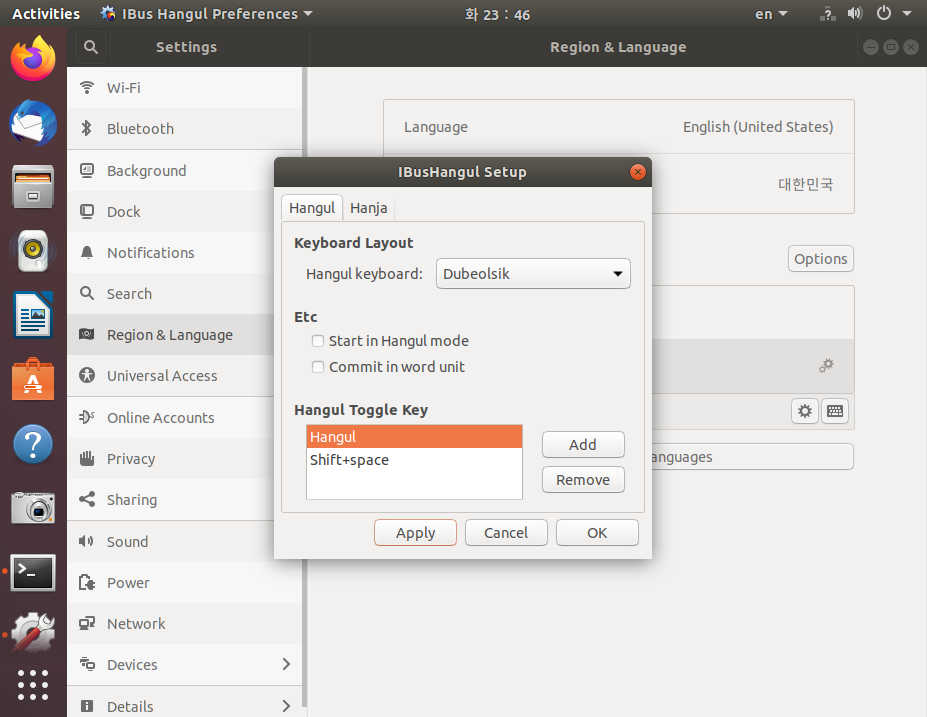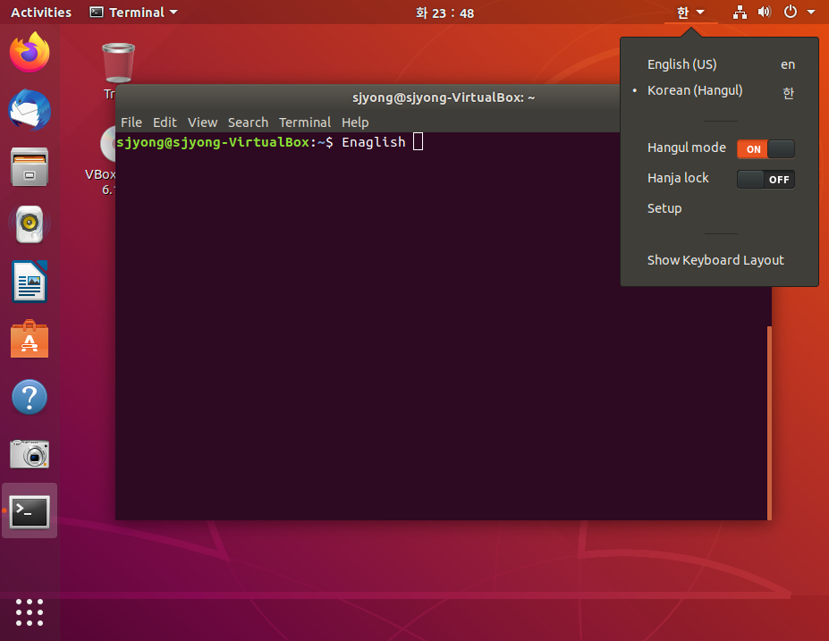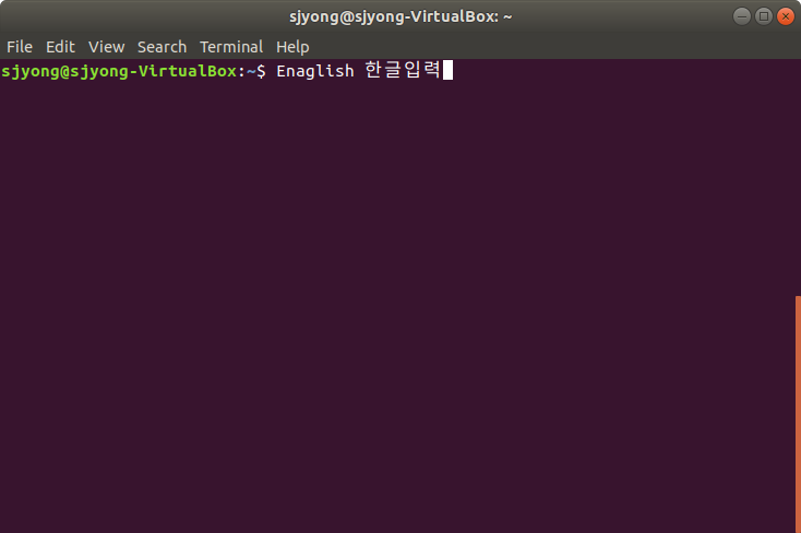 20. 위의 과정이 완료되면 터미널을 실행하고 한글입력이 가능한지 확인합니다.