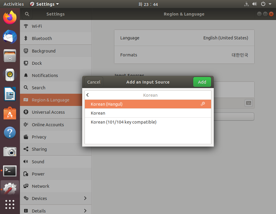 14. "Korean(Hangul)"을 선택하고 우측 상단에 있는 "Add" 버튼을 클릭합니다.