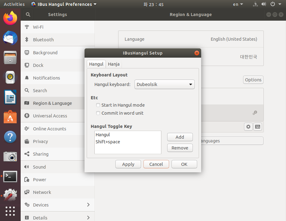 19. 우분투 화면 우측 상단에 한/영 상태 표시가 출력되면 드롭다운 버튼ㄴ을 클릭하면 "Hangul mode" 설정 부분이 OFF로 되어 있는데 이 것을 ON으로 클릭해주시면 한영 전환이 가능합니다.