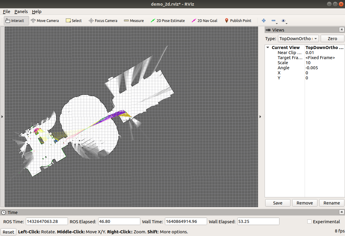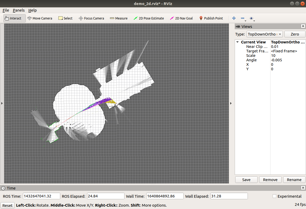 15. 아래의 그림은 RVIZ 실행 결과를 나타내는 그림들입니다. 시간이 지남에 따라 맵이 생성되는 것을 확인할 수 있습니다. Gridmap에 비해 외곽선이 간결하고 비교적 깨끗한 맵이 작성됨을 확인할 수 있습니다.
