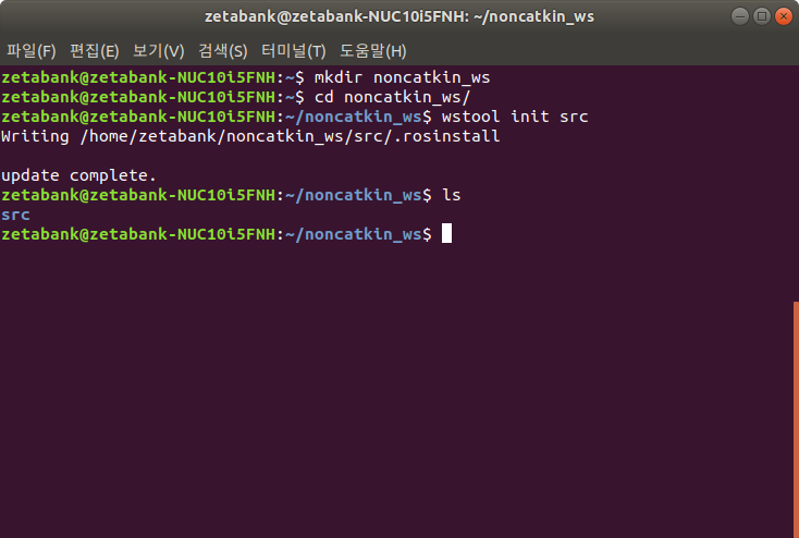3. ROS가 이미 설치된 상태에서 작업한 것입니다. 따라서 catkin_ws 폴더가 존재하며 그 위치로 이동합니다. 그리고 wstool의 초기 위치를 src로 지정합니다.