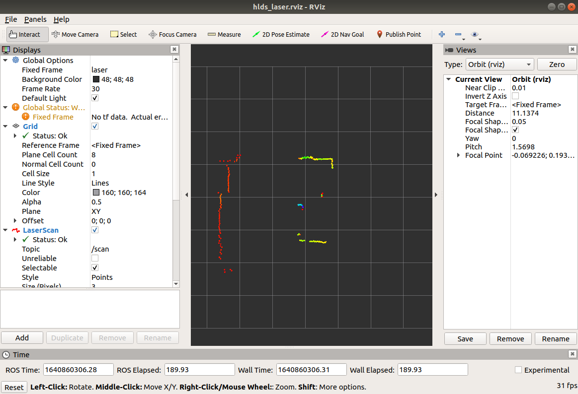 6. 거리 측정 센서 데이터가 정상적으로 취득되는지 확인하기 위해 RVIZ viewer를 실행합니다. 위의 노드가 실행될 경우 강제로 노드 정지가 실행되기 때문에 노드 실행 명령어를 중지하고 RVIZ 뷰어를 실행합니다.