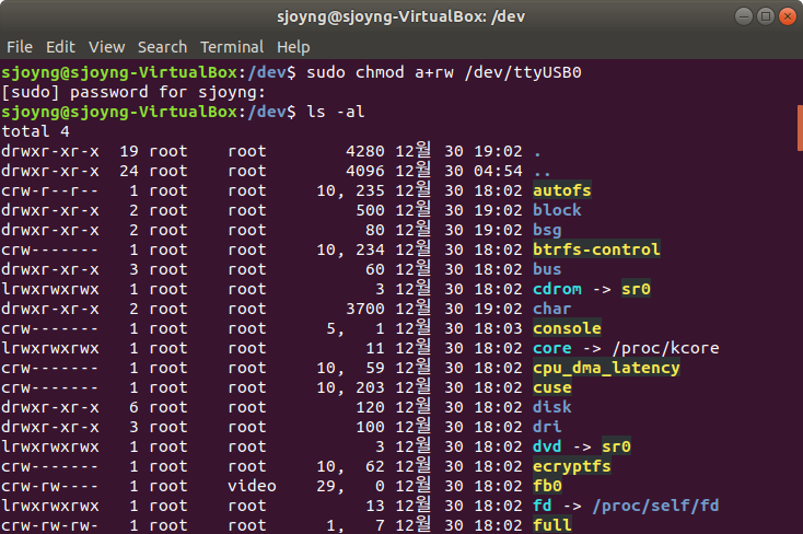 4. 아래의 명령어를 실행하여 통신 장치의 쓰기 속성을 추가합니다.