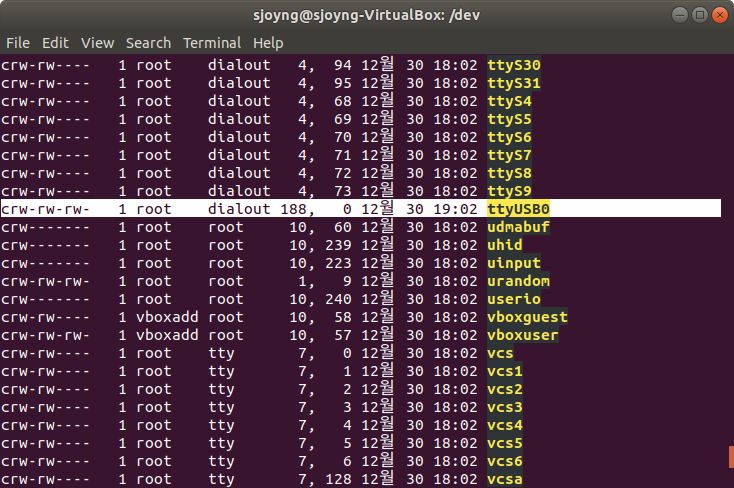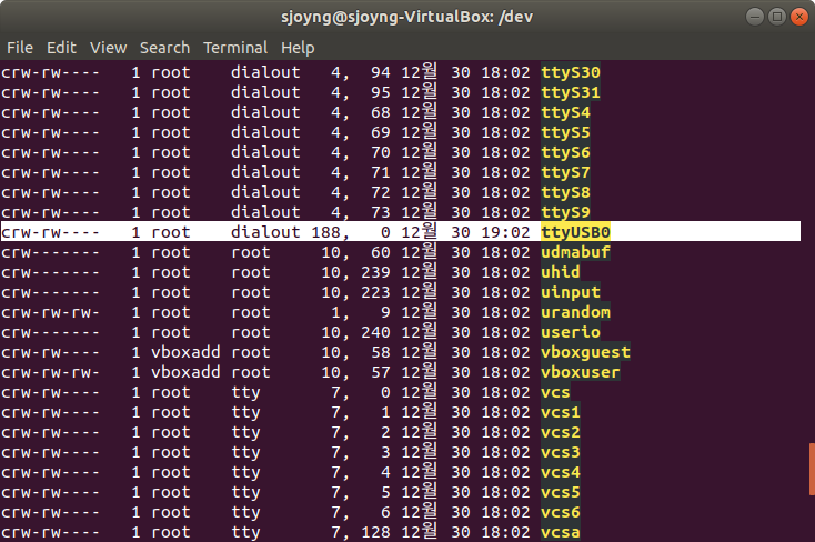 3. 거리 측정센서를 USBtoSerial 케이블로 연결하고 /dev에서 해당 장치가 마운트 되어 있는지 확인합니다.