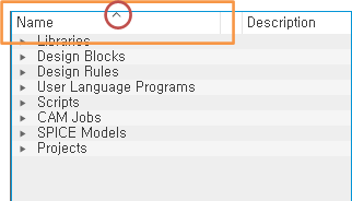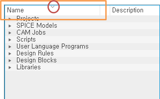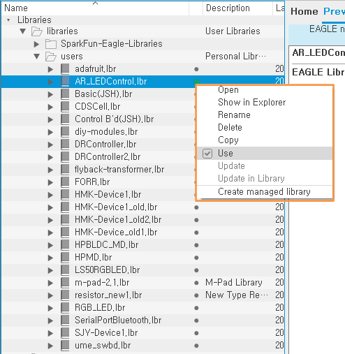 라이브러리 항목 보기에서는 Schematic에서 회로를 작성하거나 Board에서 Artwork을 수행할 때 부품의 라이브러리를 사용하게 되는데 이 때 사용되는 라이브러리의 사용 유무를 선택할 수 있습니다. “Libraries”의 ▶를 클릭하면 “Libraries”와 “Managed Libraries”, "로그인 등록 이름" 항목이 나열됩니다. 현재 등록되어 있는 라이브러리의 내용이 나열됩니다. 프로그램을 설치할 때 제공되는 라이브러리는 “Managed Libraries”에 있습니다.