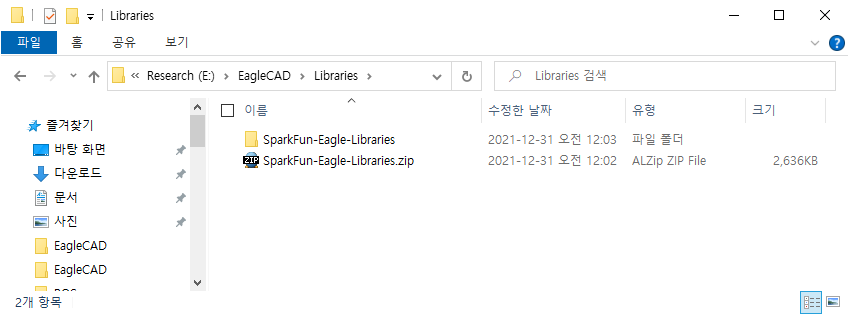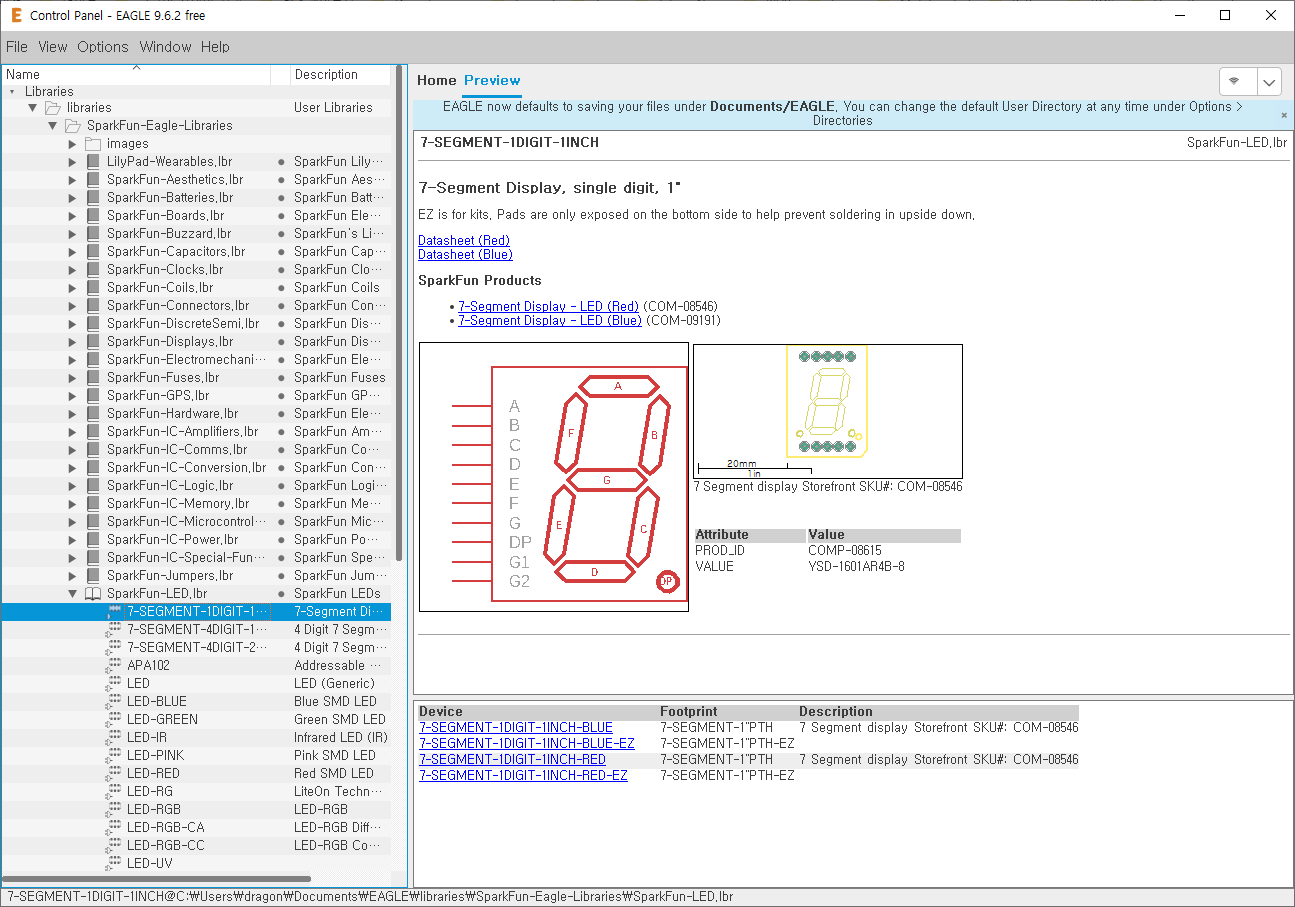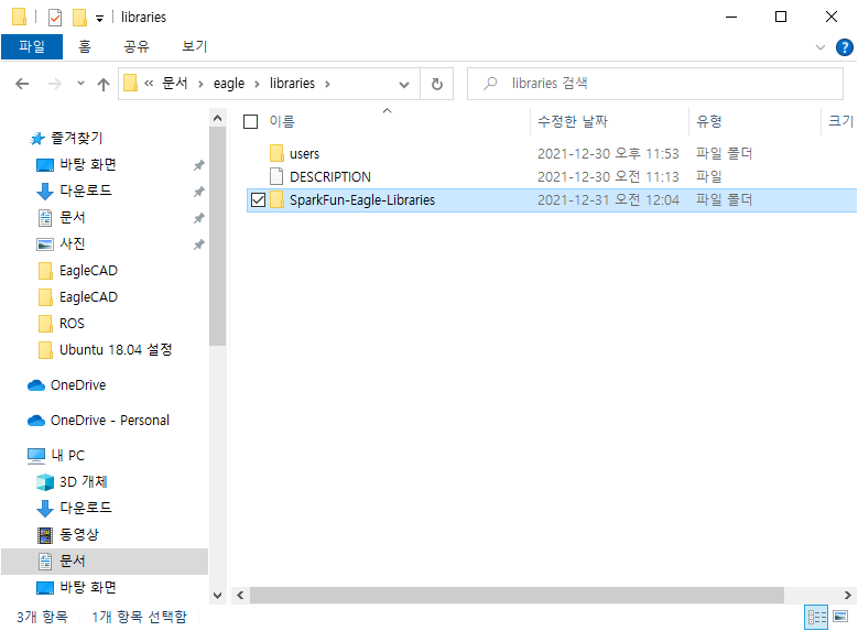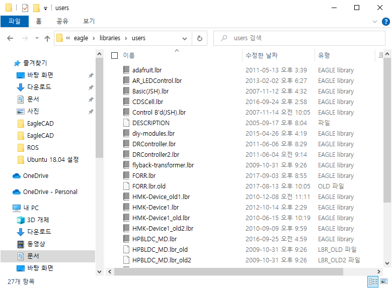 7. “Libraries”는 윈도우 사용자 문서에 설치시 만들어진 “eagle-libraries” 폴더에 사용자가 만들어 사용하는 라이브러리를 복사하면 자동으로 등록되어 라이브러리 항목에 출력됩니다.