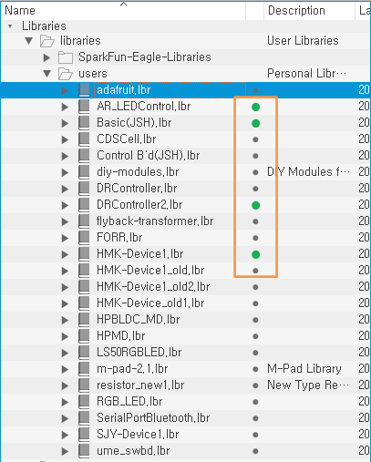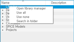 위의 그림에서 왼쪽 상단에 녹색 둥근 글머리가 있습니다. 이러한 녹색 글머리가 표시된 라이브러리는 활성화 되어 라이브러리 검색창에서 부품을 검색할 수 있고 녹색 글머리가 없는 라이브러리는 검색창에서 검색이 되지 않습니다.