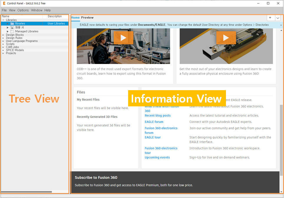 1. 제어 패널은 EAGLE 윈도우의 좌측에 위치합니다. 이 패널은 항목 보기Tree view)를 포함하고 있고 오른쪽에는 처음 실행시 정보 윈도우(Information Window)가 있습니다.