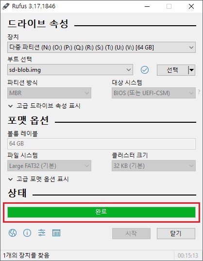 21. 조금은 긴 시간동안 이미지 쓰기를 진행하고 완료되면 프로그래스바에 완료 문구가 출력됩니다.