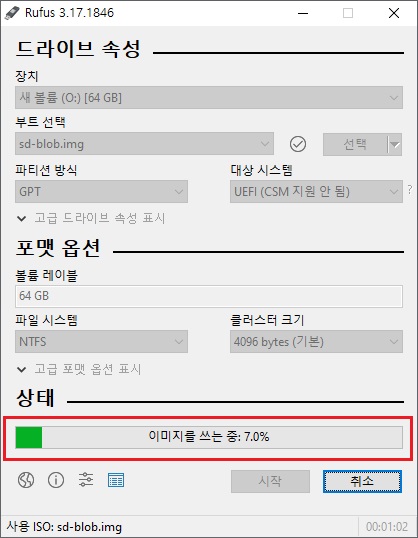 20. 이미지 쓰기를 하는 동안 프로그래스바에 쓰기 진행 상태가 출력됩니다.