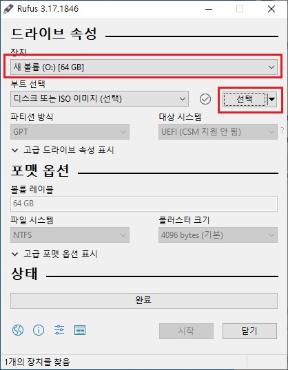 16. 다운로드를 완료하면 Rufus.exe를 실행합니다. 장치에서 micro-SD 카드의 드라이브를 선택합니다.