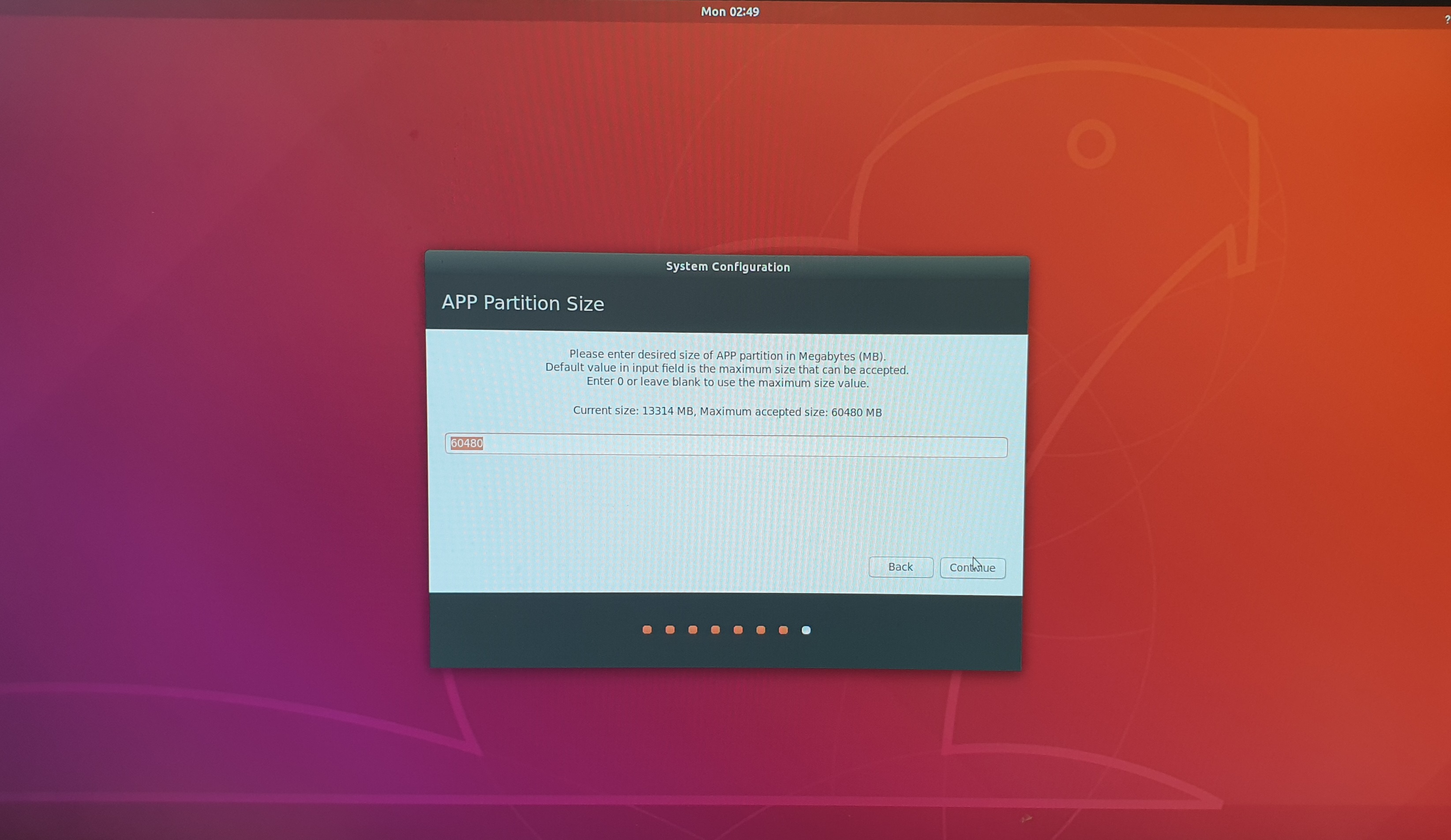 34. 응용 프로그램의 파티션 크기를 설정합니다. 현재 제공되는 최대 크기로 지정합니다.