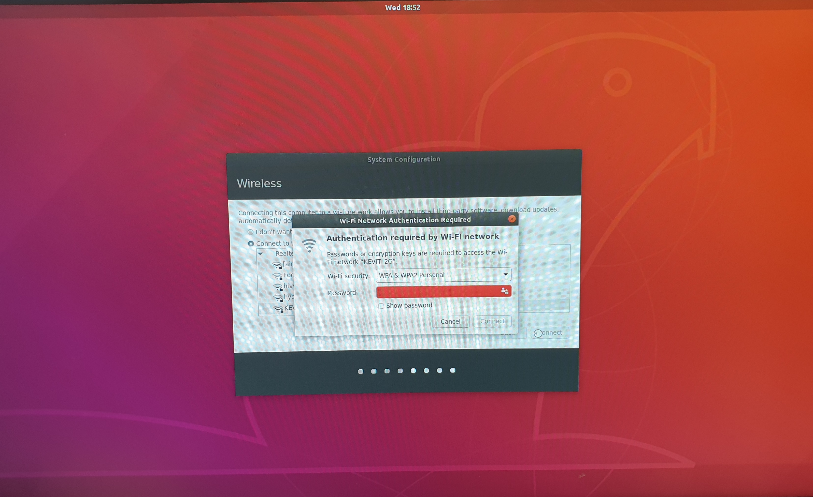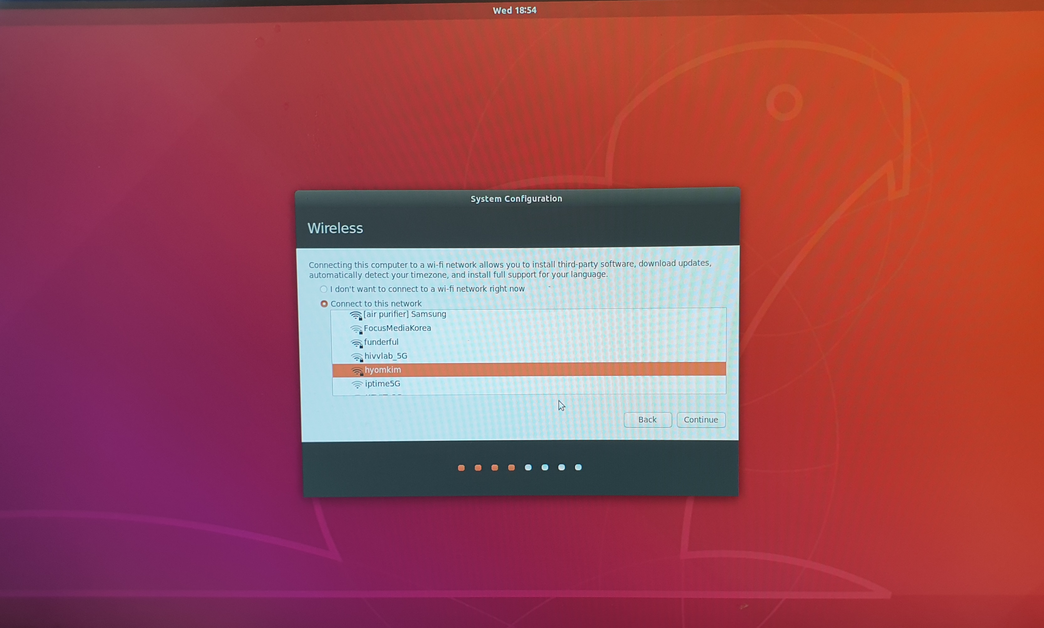 31. 무선 인터넷을 선택합니다. 연결을 위한 비번도 입력하고 continue 버튼을 클릭합니다.