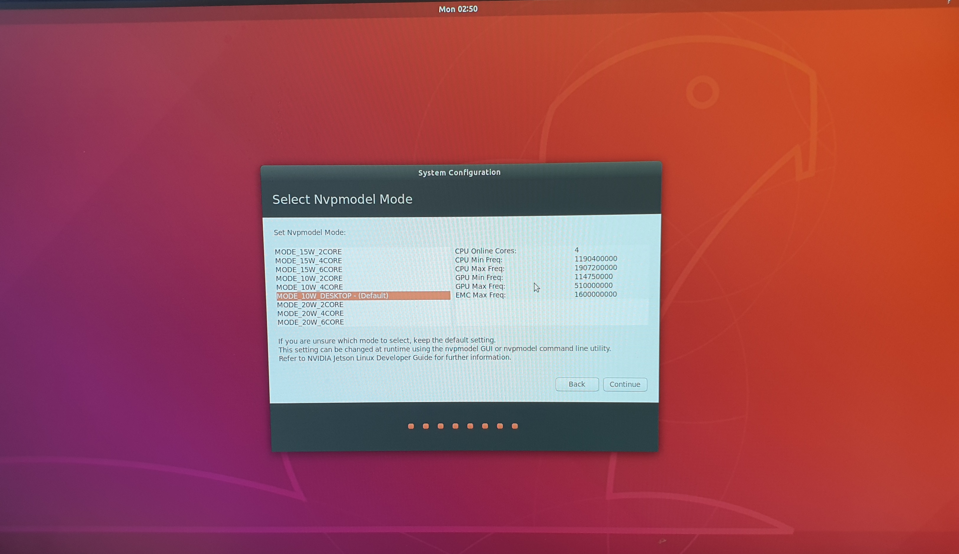 35. Xavier 보드의 구동 모텔을 지정합니다. 기본 설정인 10W 데스크탑 모델을 지정합니다.