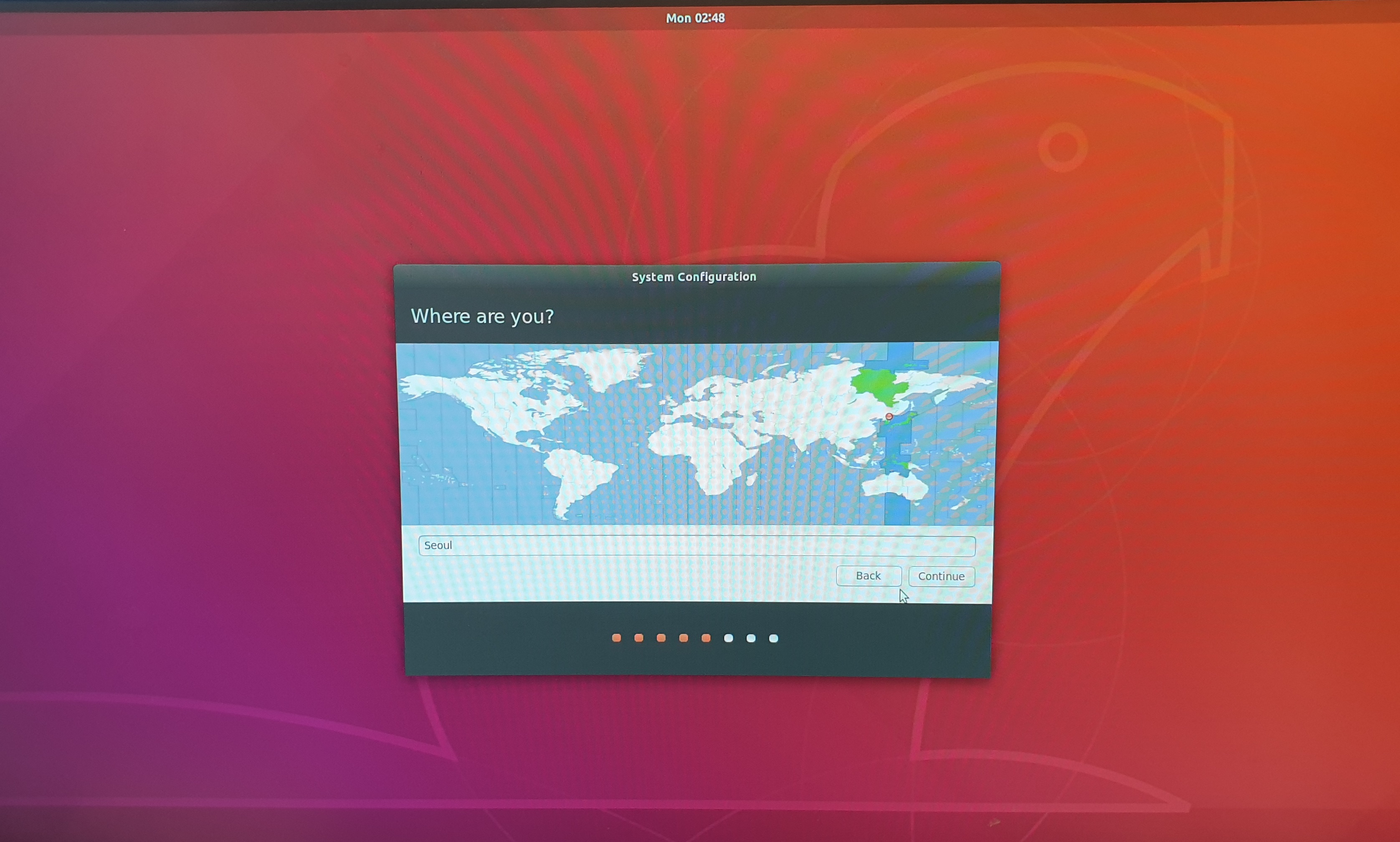 32. 우분투를 설치하는 지역을 선택합니다. Seoul을 선택합니다.