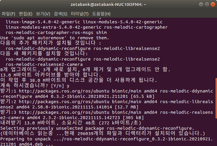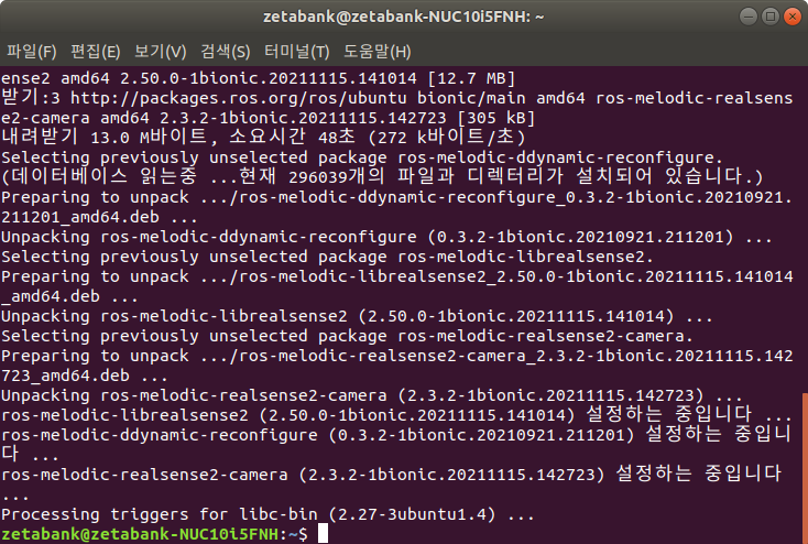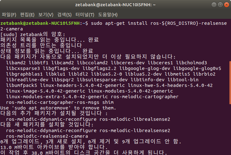 1. 아래의 명령어를 실행하여 RealSense 패키지를 설치합니다.