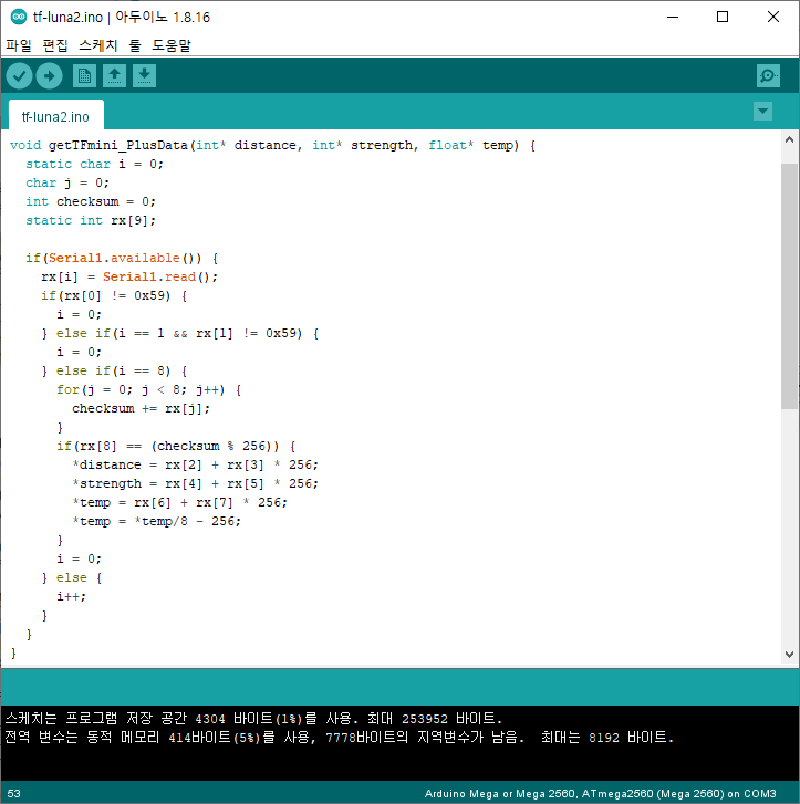 3. 스케치에서 TF-LiDAR 제품의 데이터를 취득할 수 있도록 프로그램을 작성합니다.