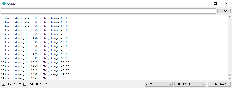 4. UART 통신 터미널을 실행하여 센서 데이터의 취득여부와 동작상태를 확인합니다.