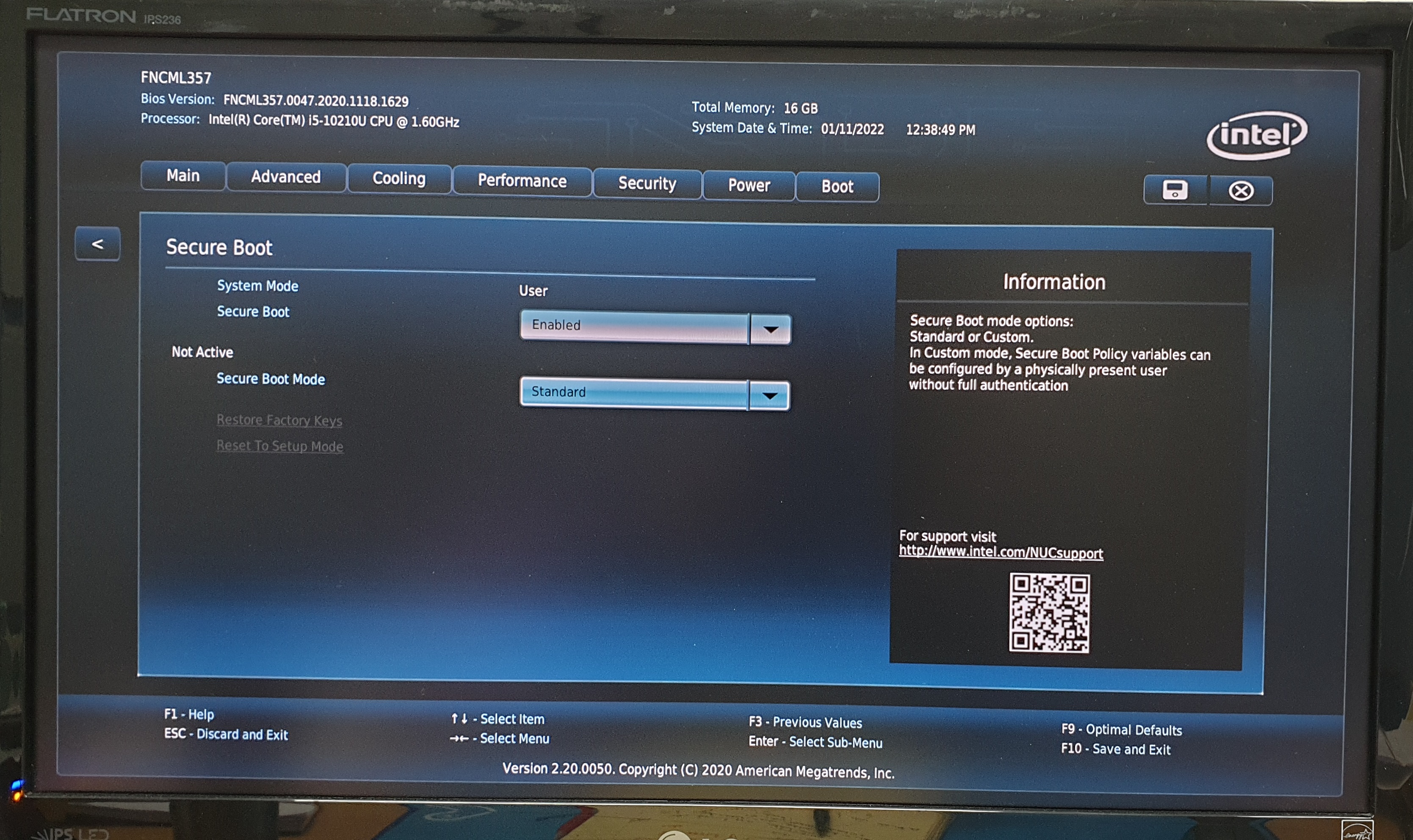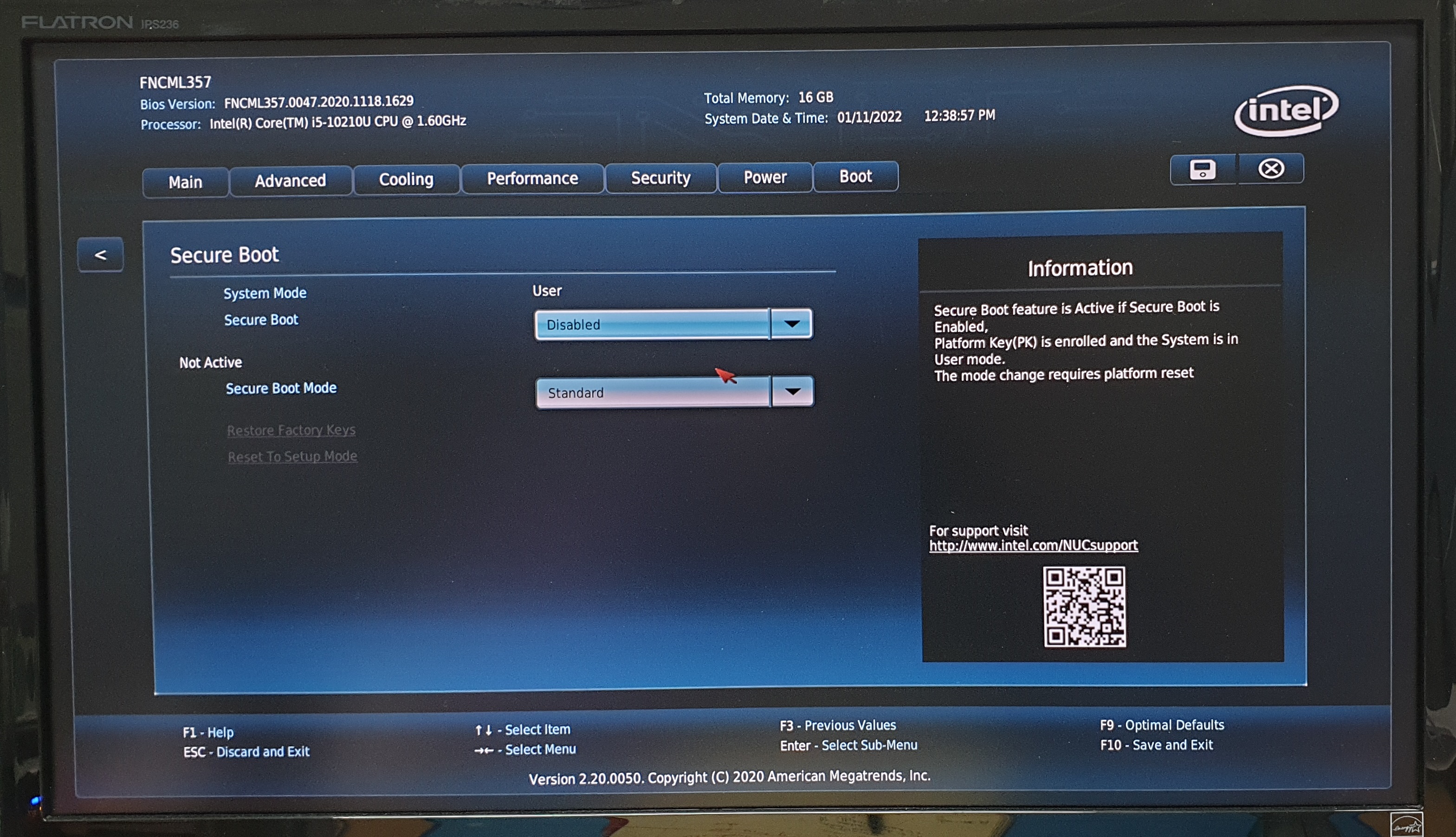 6. 리얼센스 설치 시 "Secure Boot" 옵션을 지정하라는 메세지가 잠시 출력되는데 이 때 NUC PC의 CMOS 설정이 변경된 듯 합니다. PC를 다시 부팅하고 F2 키를 눌러 CMOS Setup 화면으로 진입합니다. 아래의 그림과 같이 탭 메뉴중에 "Boot"로 이동합니다.