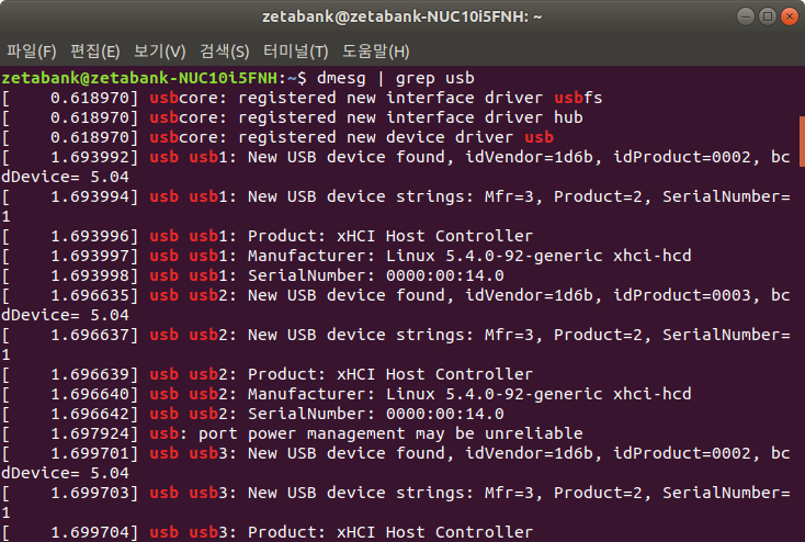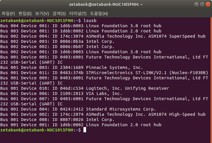 4. "lsusb" 명령어를 입력하여 현재 PC에 설치된 USB 장치를 확인합니다.