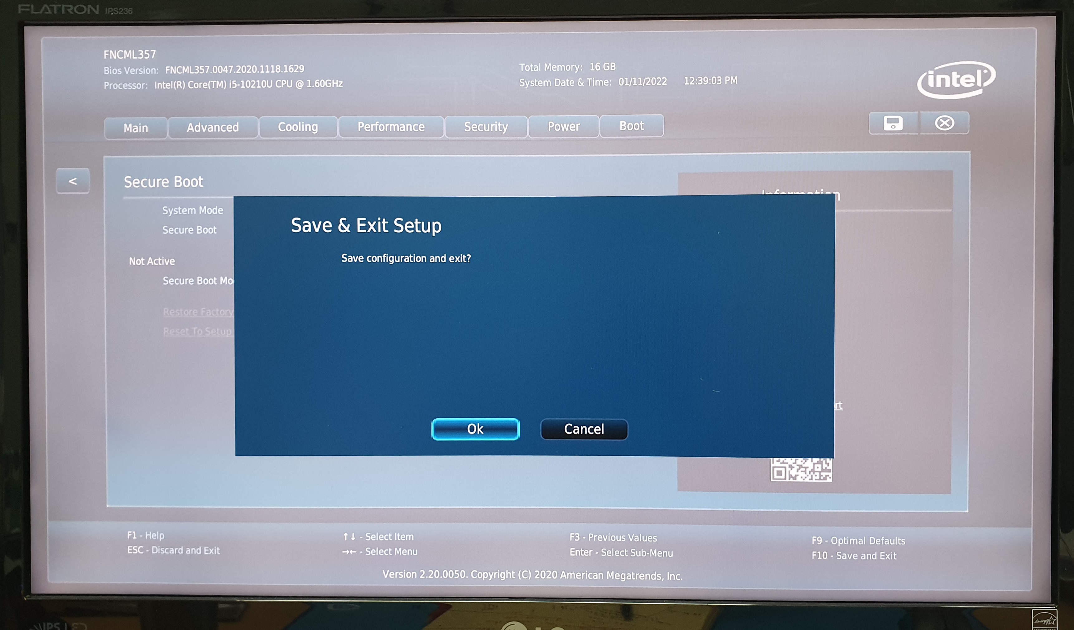 9. F10키를 눌러 설정을 저장합니다. 아래의 그림과 같이 저장 후 종료 창에서 "Ok" 버튼을 클릭합니다.