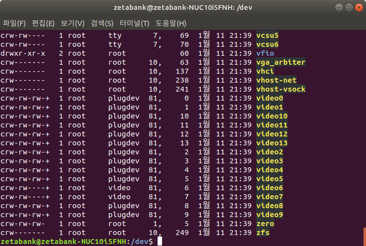 12. /dev로 이용하여 "ls -al" 명령으로 카메라가 마운트 되었는지 확인합니다.