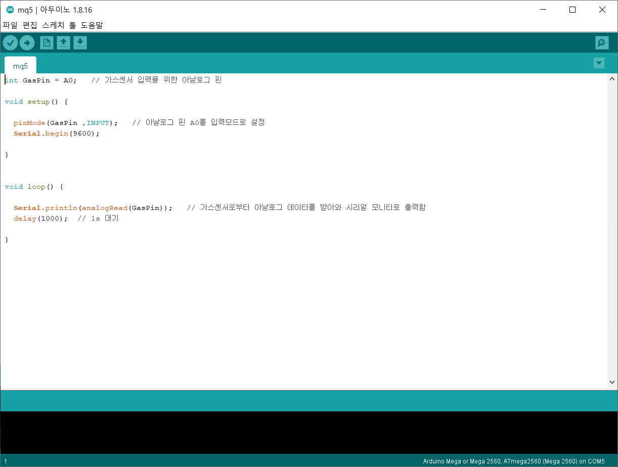 3. 스케치에서 MQ-5 제품의 데이터를 취득할 수 있도록 프로그램을 작성합니다.