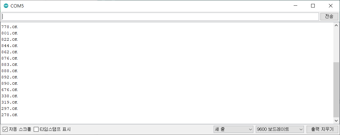 4. UART 통신 터미널을 실행하여 센서 데이터의 취득여부와 동작상태를 확인합니다.