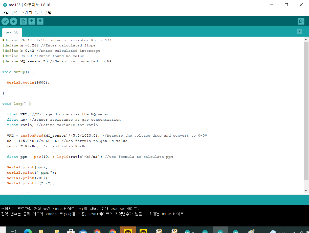 3. 스케치에서 MQ-135 제품의 데이터를 취득할 수 있도록 프로그램을 작성합니다.