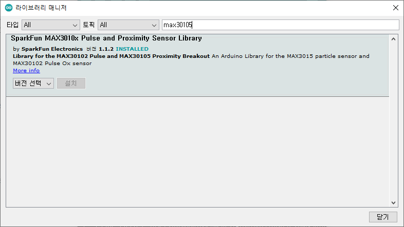 5. sketch 라이브러리 매니저에서 max30105를 검색하여 라이브러리를 설치합니다.