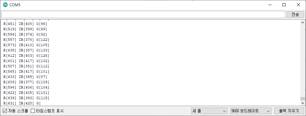 5. UART 통신 터미널을 실행하여 센서 데이터의 취득여부와 동작상태를 확인합니다.