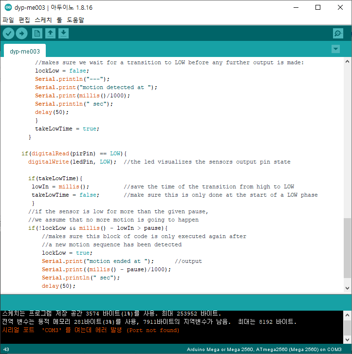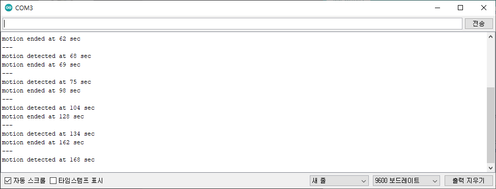 3. 스케치에서 PIR 센서 제품의 데이터를 취득할 수 있도록 프로그램을 작성합니다.