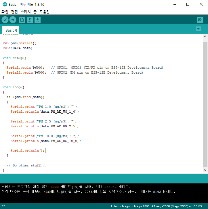 3. 스케치에서 먼지센서 제품의 데이터를 취득할 수 있도록 프로그램을 작성합니다.