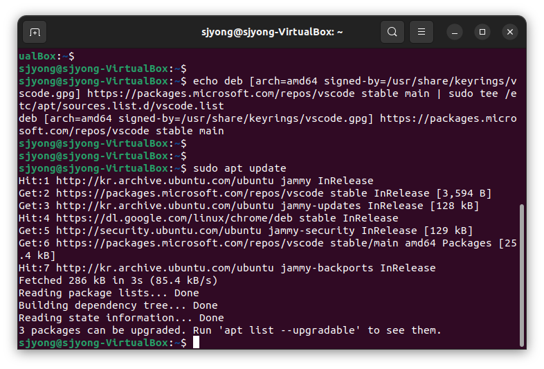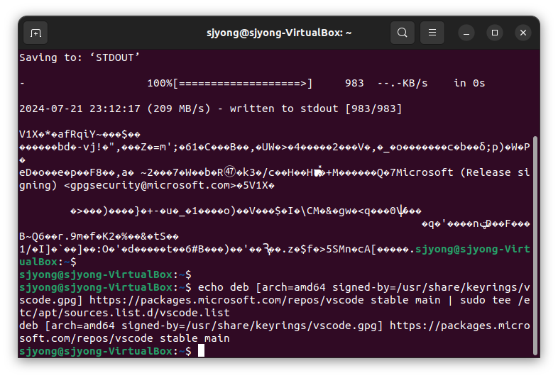 echo deb [arch=amd64 signed-by=/usr/share/keyrings/vscode.gpg] https://packages.microsoft.com/repos/vscode stable main | sudo tee /etc/apt/sources.list.d/vscode.list