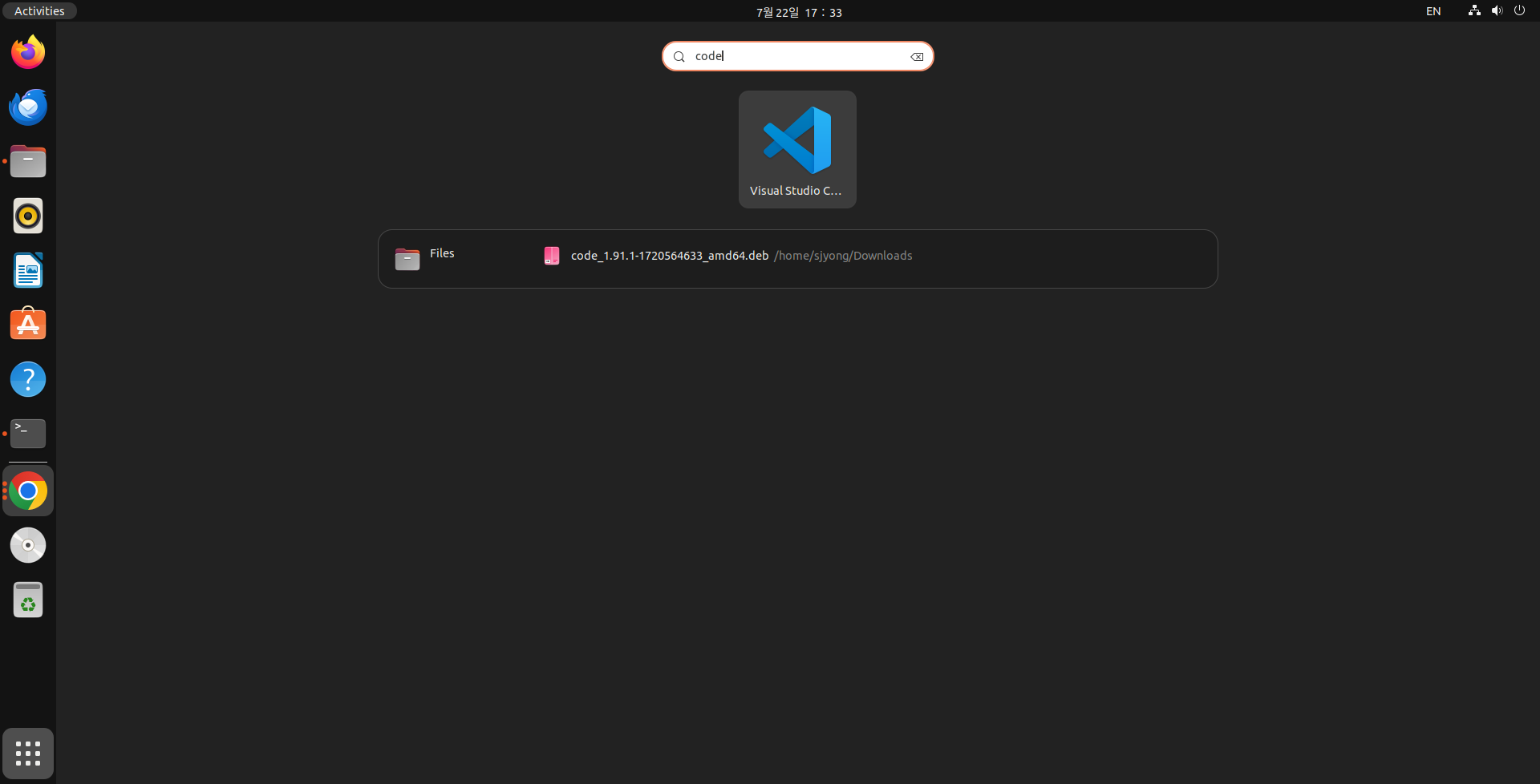 6. 정상적으로 설치가 완료되면 검색창에서 code를 입력하면 VSCode 프로그램이 검색됩니다.