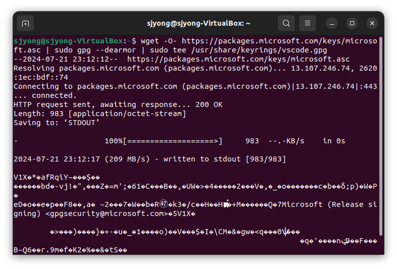 wget -O- https://packages.microsoft.com/keys/microsoft.asc | sudo gpg --dearmor | sudo tee /usr/share/keyrings/vscode.gpg
