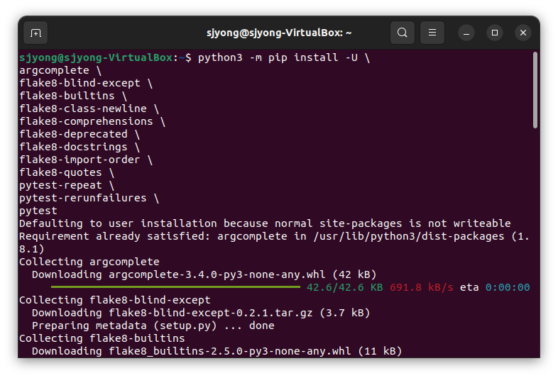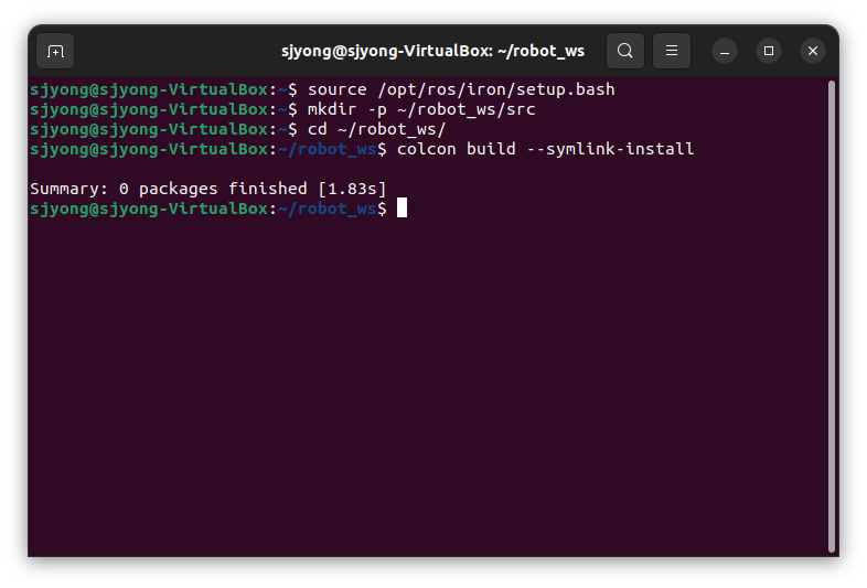 2. ROS2 툴 설치가 완료되면 정상적으로 빌드가 되는지를 확인해야 합니다. 아래의 명령을 실행하여 빌드 테스트를 수행합니다.
