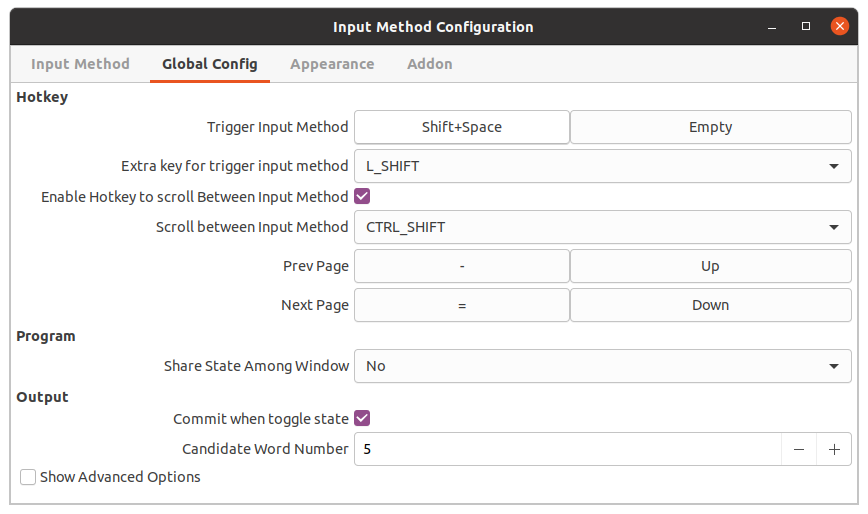 9. 위의 탭 메뉴 중에서 "Global Config"를 선택하고 "Trigger Input Method"의 "Ctrl+Space" 버튼을 클릭한 후 "Shift" 키와 "Space" 키를 동시에 눌러 "Shift+Space" 로 변경되도록 합니다.