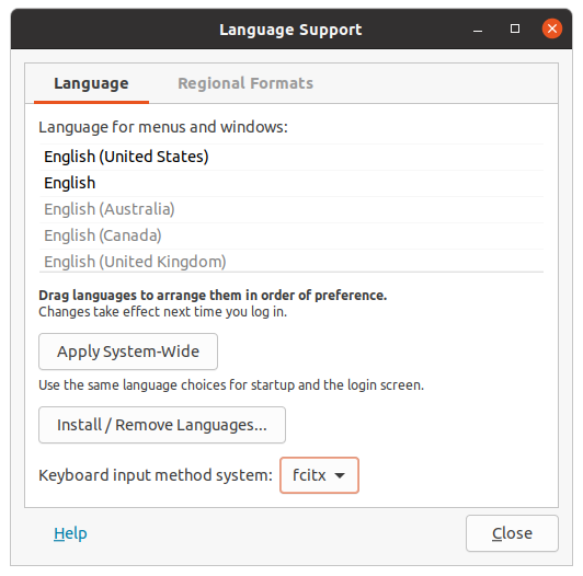 3. "Language Support" 창에서 아래쪽에 있는 "Keyboard input method system"의 드롭다운 메뉴에서 위에서 설치한 fcitx 추가되어 있습니다. 이 메뉴를 선택합니다.