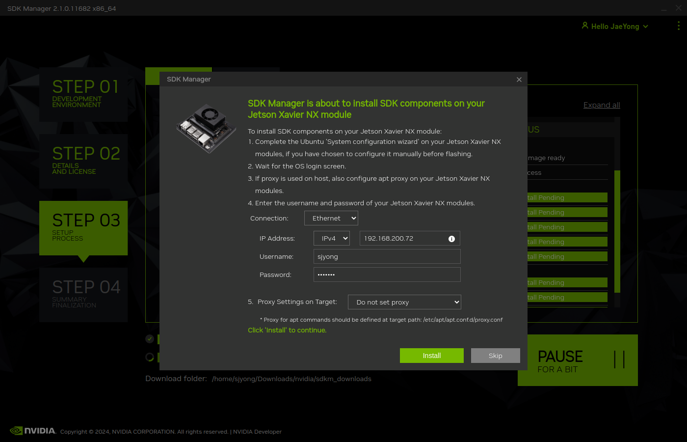 30. Jetson Xavier NX 보드는 추기 부팅상태로 유지하고, 호스트 컴퓨터에서 아래와 같이 설정합니다. "Connection"은 "Ethernet"을 선택하시고, "IP Address"는 보드에서 얻은 주소를 입력합니다. 또한 보드 초기화 시 입력한 사용자 아이디와 비밀번호를 입력한 후 "Install" 버튼을 클릭합니다.