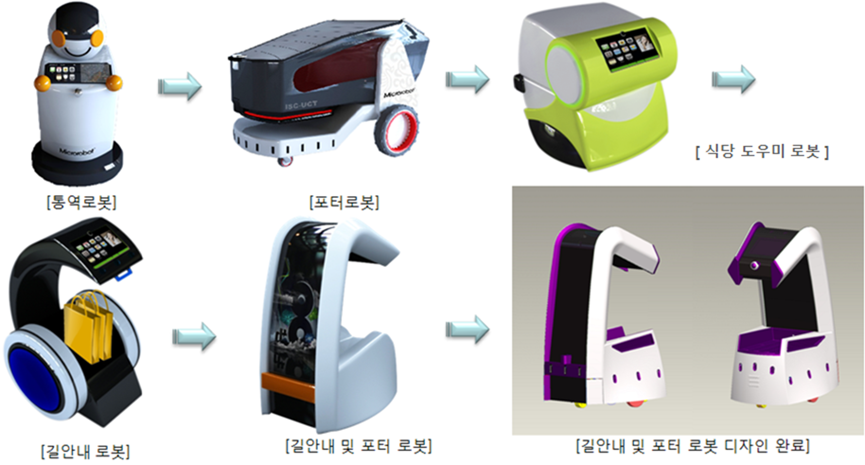 디자인 팀에서 로봇의 외관을 디자인하고 아래의 그림들과 같이 다양한 디자인 중에 품평회를 거쳐 하나의 모델을 선택하였습니다.