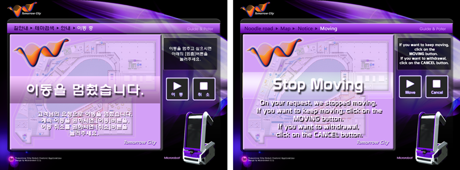 길안내를 위한 이동중 표시, 멈춤 버튼을 이용하여 길안내 서비스 중지 가능