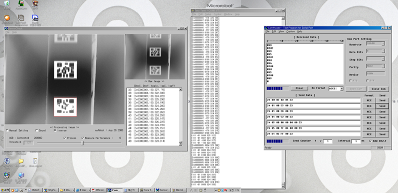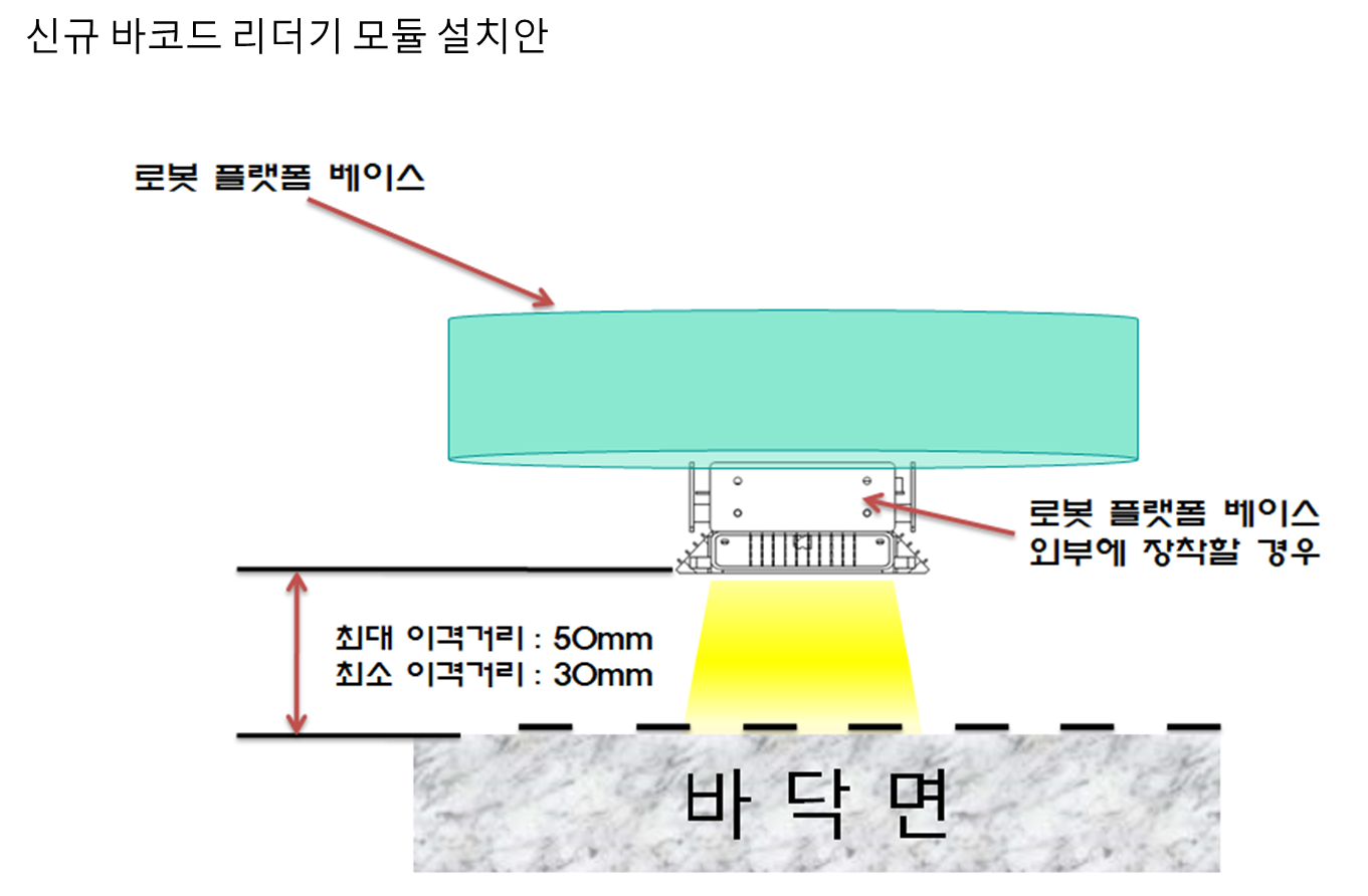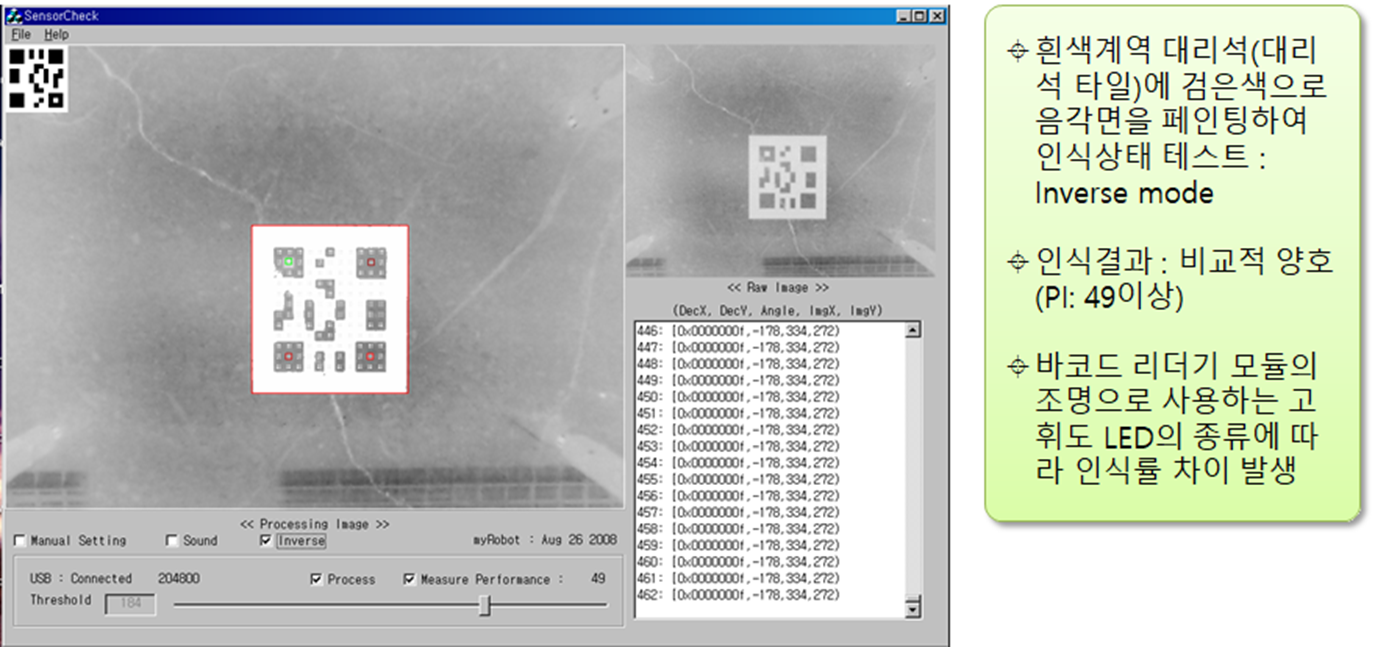 바코드 시스템은 로봇이 바닥에 인쇄되어 있는 2-D 바코드를 이동하면서 좌표의 정보를 Camera에서 읽어 들인 Code를 Camera Board에서 Code의 정보 즉 X, Y, 각도 등 여러 가지 유용한 정보를 로봇에 전달하면 로봇은 전달된 정보를 가지고 위치 인식 및 Navigation를 수행합니다.