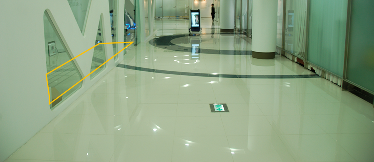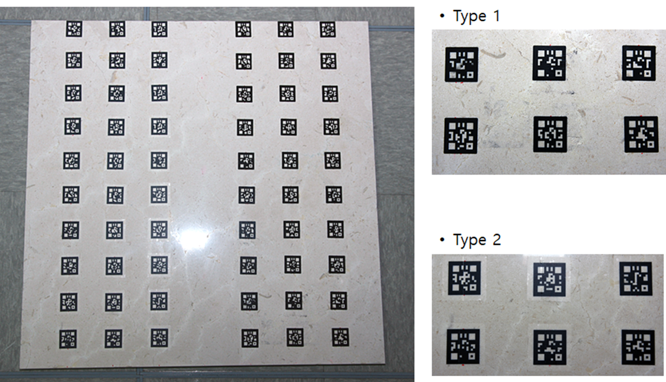 다수개의 이차원 바코드가 장판의 표면에 등 간격으로 인쇄되어 있으며 서로 다른 소정의 위치정보가 기록되어 있습니다. 자율이동로봇에 장착된 바코드 리더기가 이차원 바코드 장판을 스캔하여 자율이동로봇이 현 위치를 빠르게 인식할 수 있습니다.