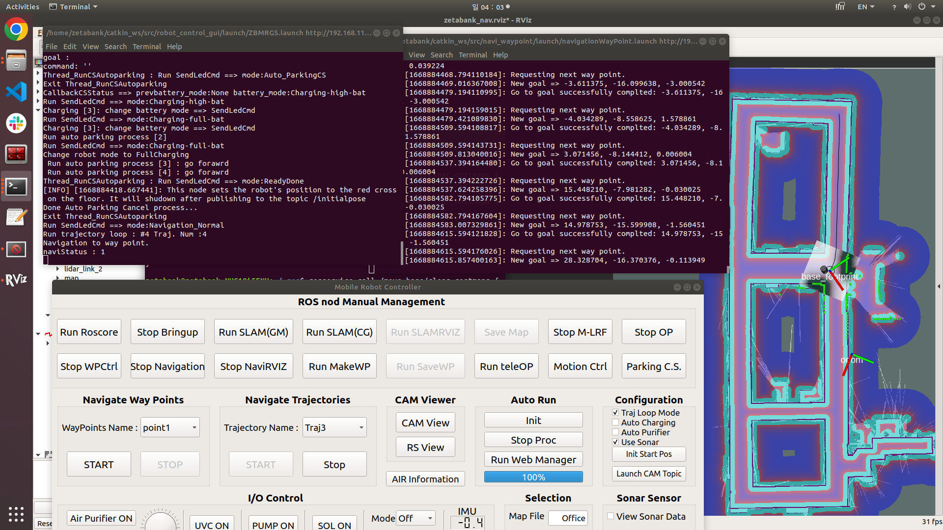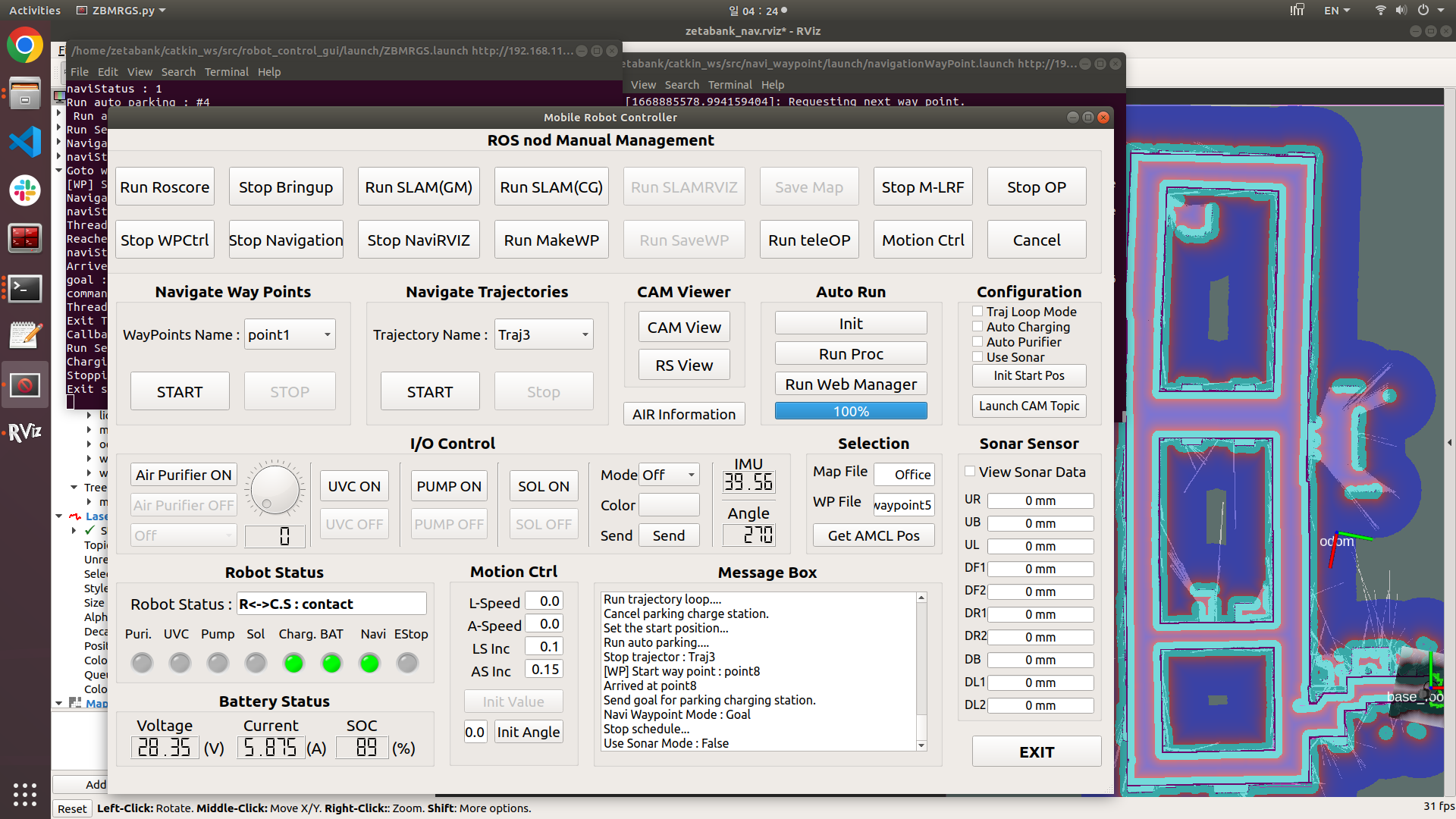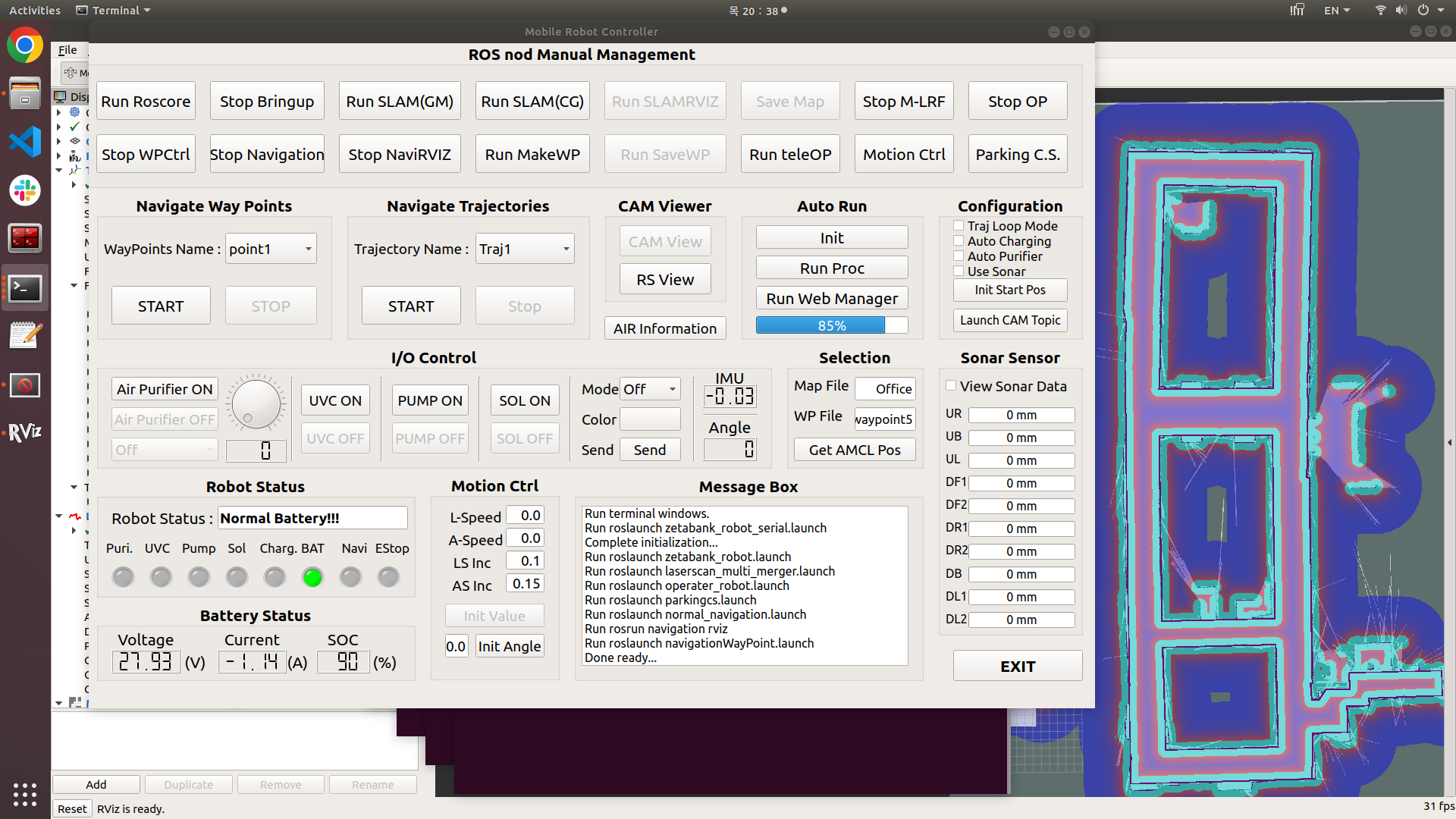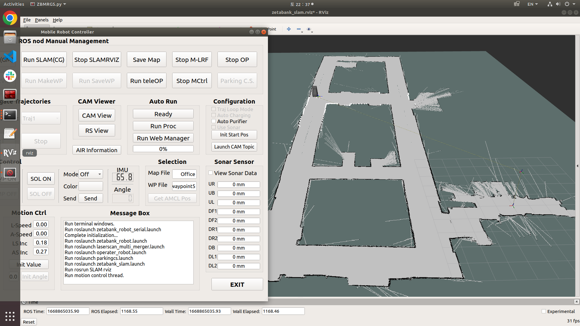 충돌회피 및 자율주행은 ROS를 사용하였으며 로봇 제어용 GUI(pyQT 이용)를 개발하여 사용하였습니다.