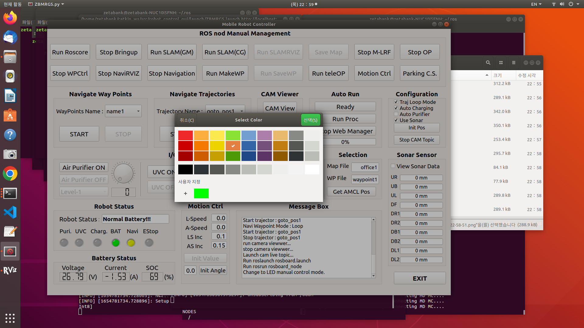 충돌회피 및 자율주행은 ROS를 사용하였으며 로봇 제어용 GUI(pyQT 이용)를 개발하여 사용하였습니다.